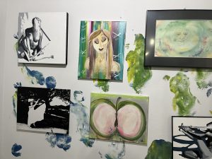 On the right of the photos you can barely see a snippet of Rodney Rahl’s sweet foursome of square mixed media heart paintings, two of them sales proceeds to Ukranian support. Rodney was a body painter for one of my reading events!…I also have fond memories of winter art sales at his lovely house.