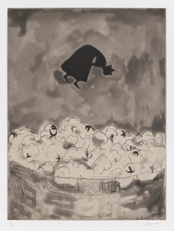 So many standouts in this exhibit; Ambreen Butt’s (Pakistani, 1969) Daughter of the East suite of five etchings (2008) based on photographs of women protesting at the Red Mosque in Islamabad, abstract and make beautiful such complex events. Amy Sherald’s (American, b. 1973) stunning Handsome (2020) color screenprint presents a strong young man in Sherald’s traditional gray skin tones,