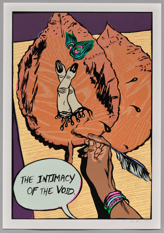 The series of four colorful, comic-styled prints by Chitra Ganesh (American, b. 1975) were especially provocative and exciting. Intimacy of the Void (2014) (below © Chitra Ganesh/Durham Press, 2014), a screenprint and woodblock print, shows a pink-braceleted hand drawing, with a feather onto big orange leaves, two dismembered fingers, and green pink-hearted feather, with a speech bubble pointing to what would be the artists’ head (in viewer’s gaze): “THE INTIMACY OF THE VOID.”